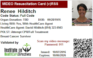 | Figure 1: This resuscitation card links to a video by the patient explaining their care preferences:https://vimeo.com/user44599014/review/188926708/25b475b740 The password is: 911. |